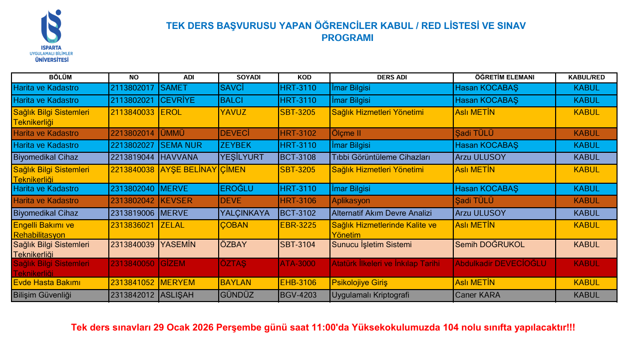 Tek ders sınavları Yüksekokulumuzda 29 Ocak Perşembe günü saat 11:00'de 104 nolu salonda yüz yüze yapılacaktır.